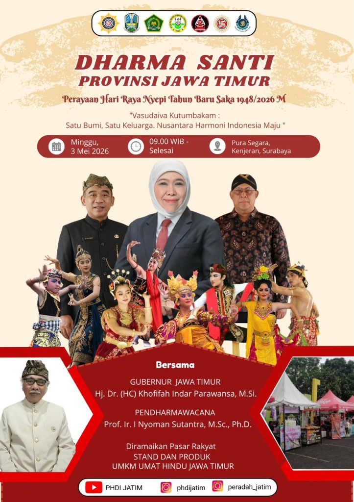 ” Om Swastiastu, Kepada segenap umat Hindu di Kota Surabaya, mari kita menjadi tuan rumah yang hangat. Mari menyambut saudara-saudara kita, umat Hindu se-Jawa Timur, dalam acara Dharma Santi Nyepi Tingkat Provinsi Jawa Timur. Catat waktunya : Minggu, 3 Mei 2026 Pukul 09.00 – selesai di Pura Segara Surabaya.